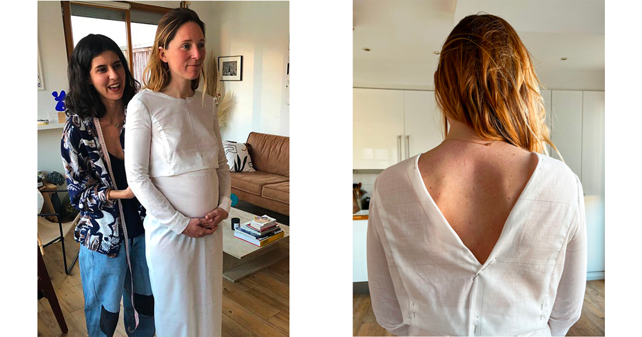 Je construis la première toile. Fidèle au dessin, elle est réalisée en toile de coton et permet un premier essayage, à domicile ou dans mon atelier. Ce RDV permet de visualiser votre tenue, et de prendre les retouches qui rendent votre modèle unique.